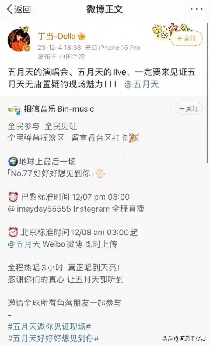 歌手丁当在个人社交账号上转发了五月天演唱会的动态,并配文:“五月天的演唱会、五月天的live,一定要来见证五月天无庸置疑的现场魅力!!!”。这一举动无疑是在力挺五月天,对他们演唱会的真实性和现场魅力给予了高度评价。