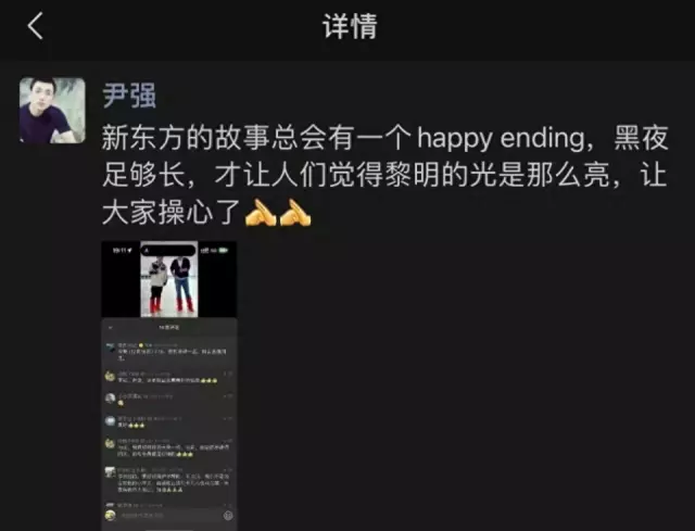 12月16日,东方甄选CFO尹强在朋友圈表示,新东方的故事总会有一个happy ending(编注:意指圆满结局),黑夜足够长,才让人们觉得黎明的光是那么亮,让大家操心了。
