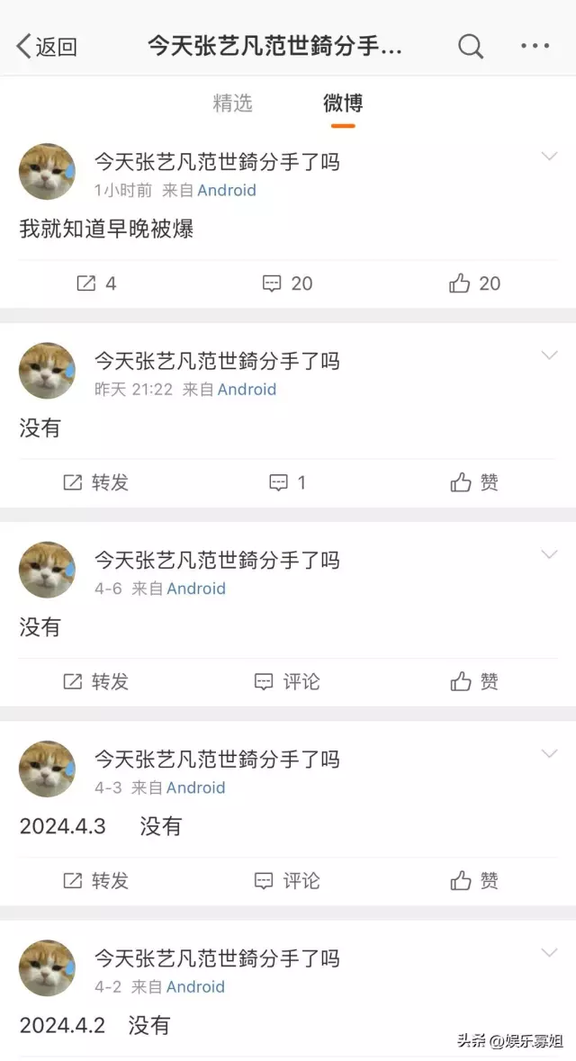 果然粉丝真的什么都知道,“今天张艺凡范世錡分手了吗”这个微博正在打卡分手博,据说张艺凡范世錡都谈了小一年了,且两位相差8岁。张艺凡被扒出曾在去年12月发了一条“听说北京下雪了,让我也看看”,没过俩小时范世錡就发了一组雪景照。