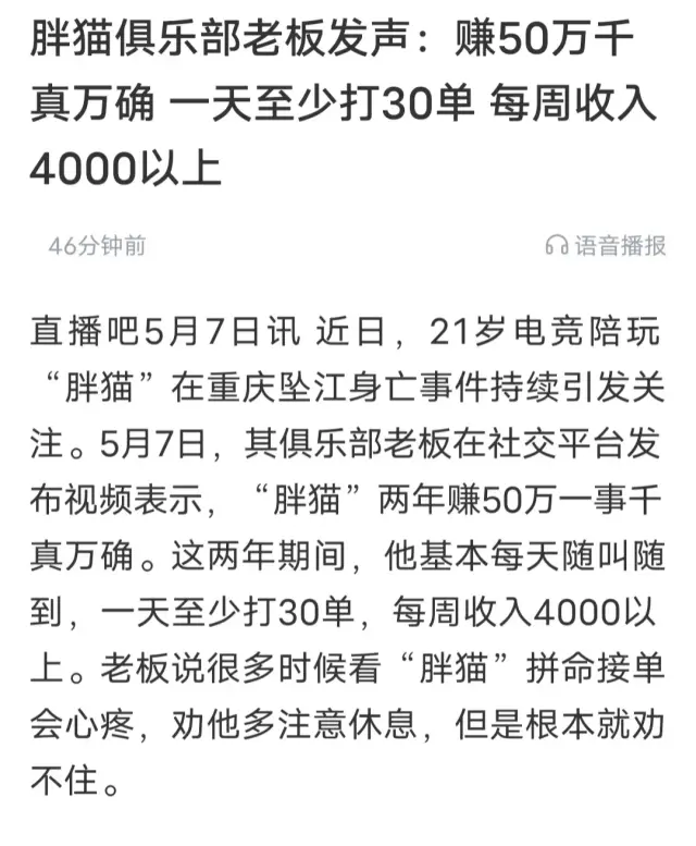 连胖猫俱乐部老板发声:胖猫赚50万千真万确,一天至少打30单,每周收入4000元以上,月入2万很正常。老板说很多时候看“胖猫”拼命接单会心疼,劝他多注意休息。