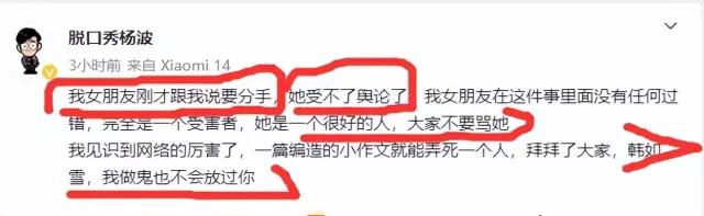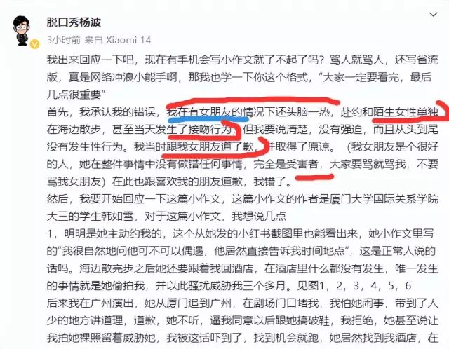 #有女朋友还和别人接吻# #女大学生韩如雪##脱口秀演员杨波回应#
