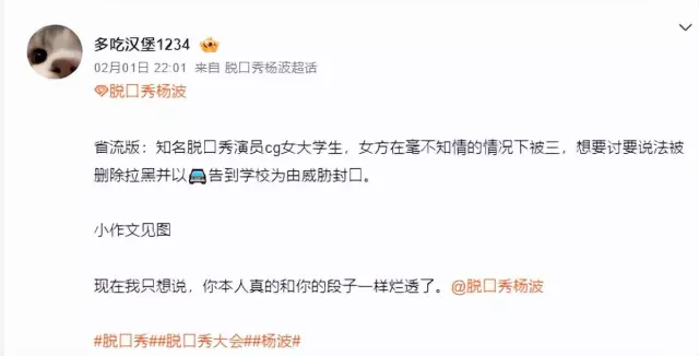 2月2日,知名脱口秀演员杨波针对女大学生曝光他有女朋友还与自己接吻并开房做出了回应,引发热议。