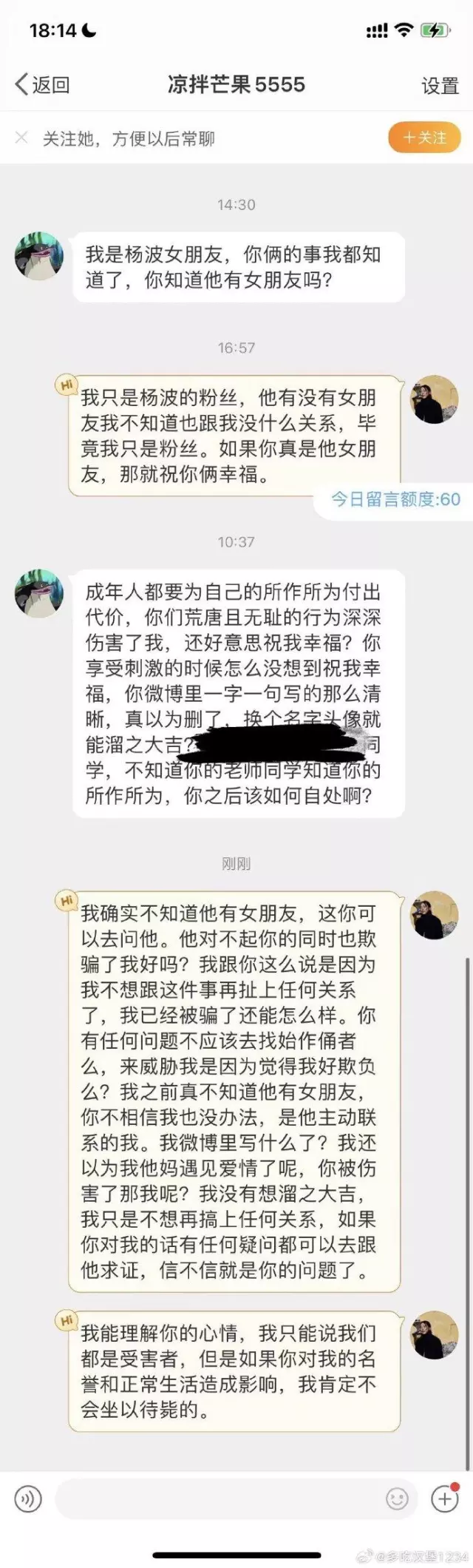 1、杨波向你坦诚他与其她女孩接吻后,如果你能接受自己男友劈腿就继续受着,接受不了就分手,不应该去骚扰女大学生。