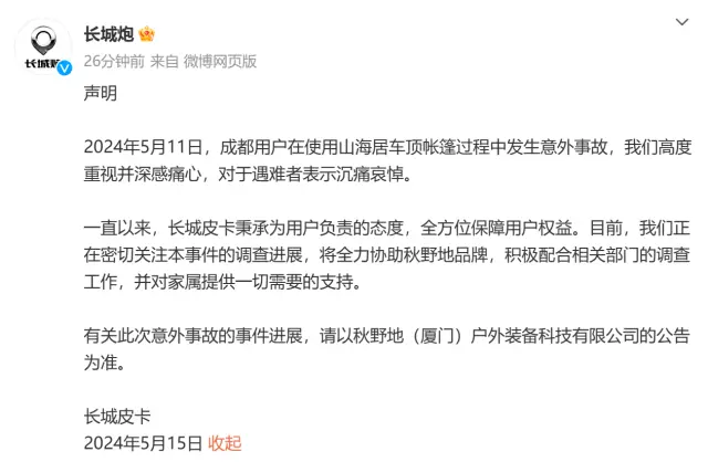 5月15日,长城炮官方微博发布官方声明表示,对于5月11日成都用户在使用山海居车顶帐篷过程中发生意外事故高度重视并深感痛心,对于遇难者表示沉痛哀悼。