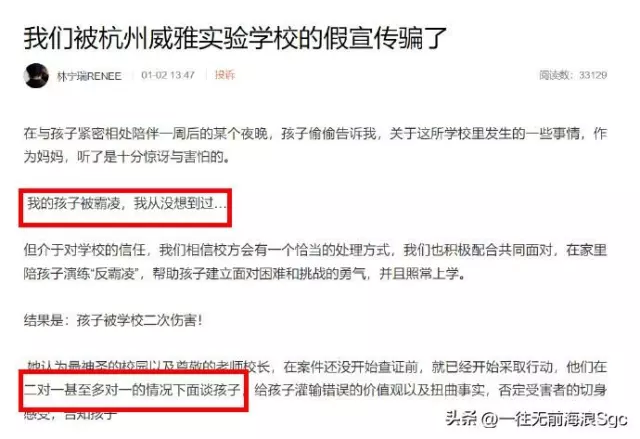 林宁瑞称自己8岁的女儿就读于杭州威雅实验学校,在和女儿亲密相处一周后,林宁瑞女儿悄悄告诉自己被校园霸凌。