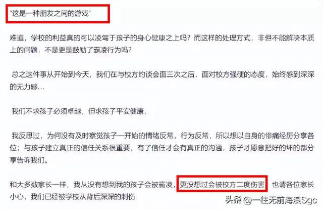 林宁瑞本以为学校会公正处理,没想到却被校方“二次伤害”。林宁瑞称校方在二对一甚至多对一的情况下和孩子面谈,试图将校园霸凌解读为“朋友之间的一种游戏”。学校的不作为甚至逃避,让林宁瑞直言难以接受,这才有了这篇长文。