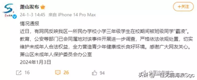 随后,萧山区未成年人保护委员会也对此事做出回应,称教育和公安部门会对同属地该事件进行进一步调查,会切实维护未成人合法权益。