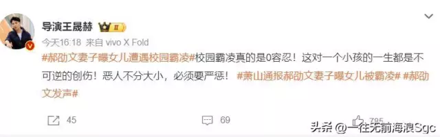 此外,导演王晟赫也对此事发表看法,称对校园霸凌真的是0容忍!这对一个小孩的一生都是不可逆的创伤!恶人不分大小,必须要严惩。