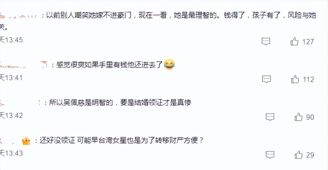 但在部分网友看来,吴佩慈还是比好姐妹安以轩幸运得多,她没有和纪晓波领证,在网友看来,不仅不用承担连带责任,或许纪晓波已经事先进行了财产转移,大不了吴佩慈拿着一大笔钱,带着孩子逃之夭夭,日子依然过得非常舒服。