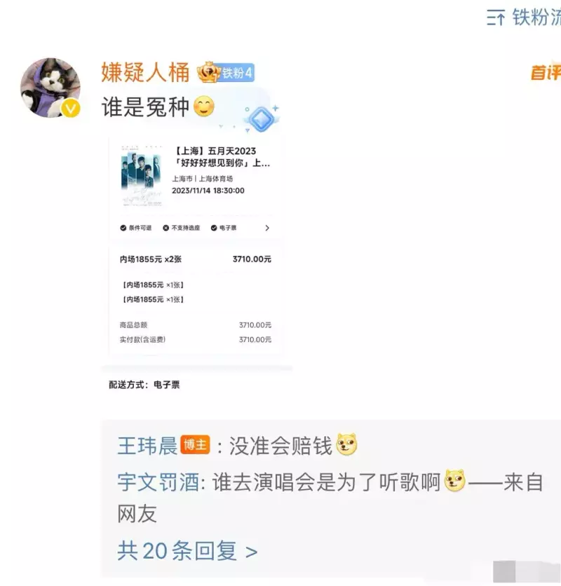 知情人透露,如果五月天真的被调查出假唱行为,是需要假一赔三的。有人花了3710元买的内场票,赔三倍就是14000多块钱,真不是一笔小数目,每个人都赔的话,五月天这连续6场演唱会不是白忙了么?