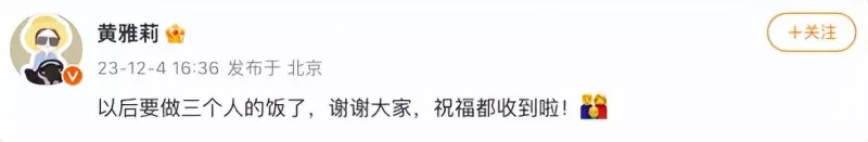 对此,黄雅莉发文回应怀孕传闻 :“以后要做三个人的饭了,谢谢大家,祝福都收到啦!”