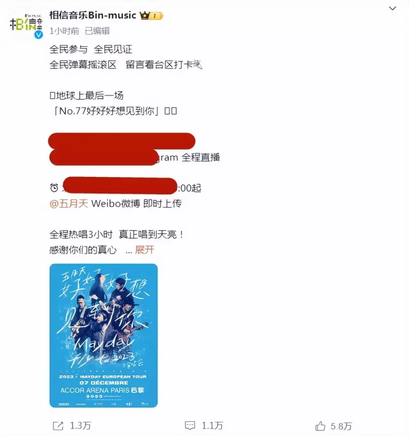 12月3日,随着五月天演唱会假唱事件愈演愈烈,五月天方相信音乐在官微发文回应,相信音乐晒出巴黎演唱会的宣传海报,并在文中称演唱会将进行全程直播,全民参与、全民见证,五月天这是要用实际行动证明演唱会没有假唱。