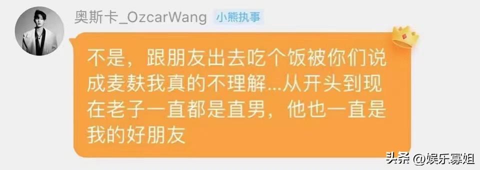 嗨!这里是娱乐寡姐,为你带来最新娱乐资讯。奥斯卡和胡烨韬吃饭被拍,让不少CP粉嗑到了,也有不少网友质疑性取向,也有人说他俩麦麸的,对此,奥斯卡在粉丝群回应:老子一直都是直男,还表示他和胡烨韬一直都是好朋友。引发全网热议。