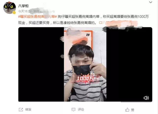 12月18日,知名狗仔追瓜少年阿飞在直播中爆料张嘉倪和买超离婚内幕,阿飞爆料称张嘉倪和买超离婚事还没有解决完,买超和张嘉倪离婚,需要给张嘉倪1000万现金,买超手里没那么多钱,为了凑钱,买超把房子都卖了。
