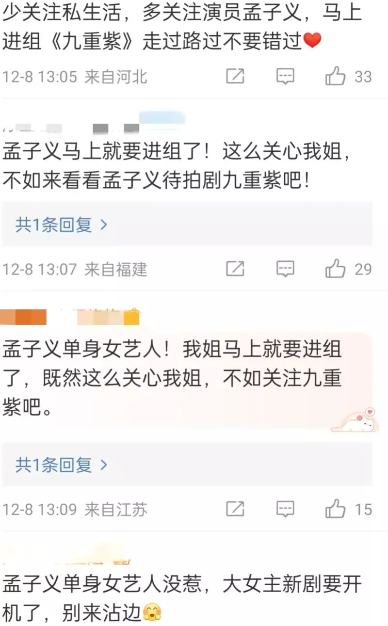 但孟子义的粉丝们对这个消息还是很抵触的,一直在狗仔爆料的评论区里说孟子义是单身女艺人,不要来沾边。