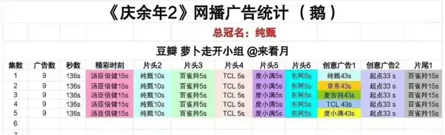 据网友统计,目前共有45广,总时长约675s 。单集有9广,其中还有两个创意广告插播,单个约42s。就是你看得最起劲的时候,中插猝不及防就来了。