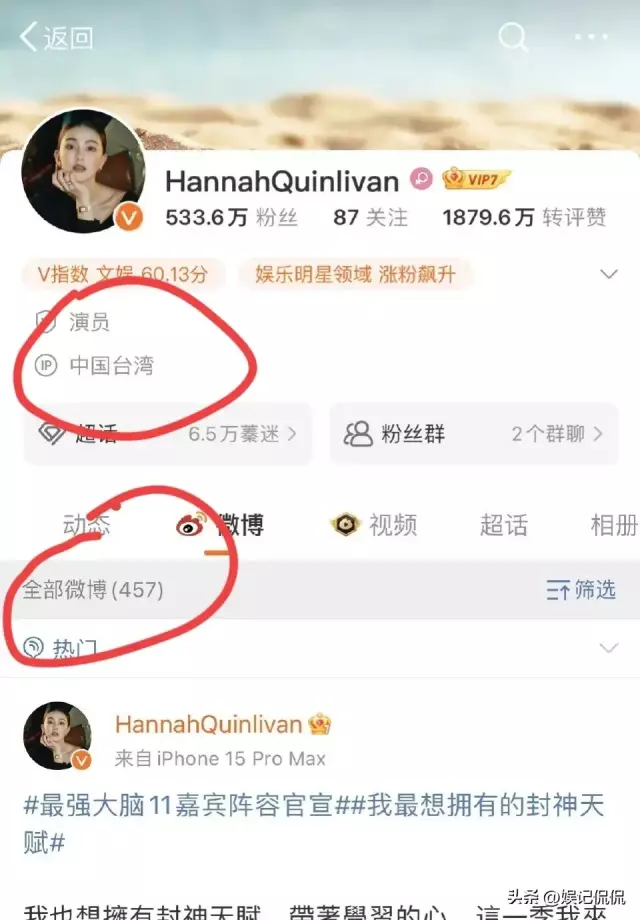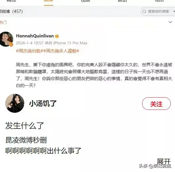 2、本来昆凌最后一条微博是2023年12月份发的,一共457条微博,结果造谣的人p图微博总数还是457条,p的太假了,这漏洞实在是太过显而易见了