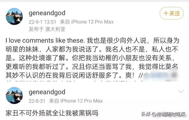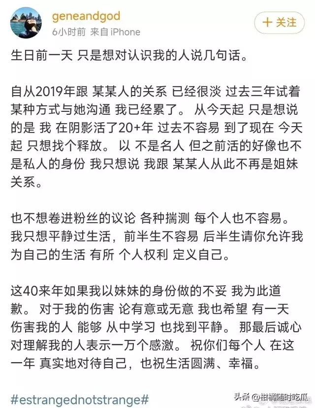 自从2019年跟某某人的关系已经很淡过去三年试着某种方式与她沟通我已经累了。从今天起只是想说的是 我在阴影活了20+年过去不容易到了现在今天起 只想找个释放。以不是名人但之前活的好像也不是私人的身份我只想说我跟某某人从此不再是姐妹关系。