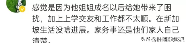 感觉是因为他姐姐成名以后给她带来了困扰,加上上学交友和工作都不太顺。在新加坡生活没啥进展。家务事还是他们家人自己清楚。