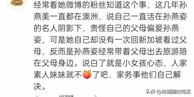 经常看她微博的粉丝知道这个事,这几年孙燕美一直都在澳洲,说自己一直活在孙燕姿的名人阴影下,责怪自己的父母偏爱孙燕姿,可是她自己却没有一次回新加坡看过父母,反而是孙燕姿经常带着父母出去旅游陪在父母身边。说白了就是小女孩心态,家务事他们自己解决。