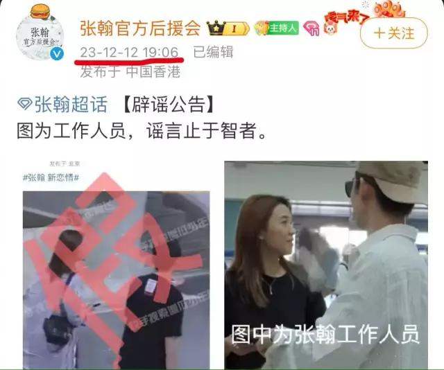 “阿飞”爆料的时间在晚间6点53分,张翰官方后援会的澄清时间为7点06分,中间之间隔了13分钟,速度超快的,可见他有多害怕被曝光恋情。