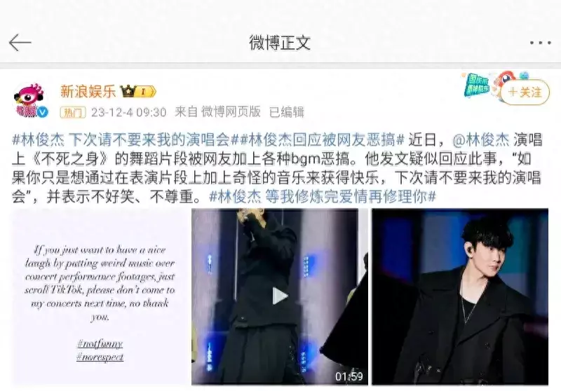 近日,林俊杰演唱上《不死之身》的舞蹈片段被网友加上各种bgm恶搞。他发文疑似回应此事,“如果你只是想通过在表演片段上加上奇怪的音乐来获得快乐,下次请不要来我的演唱会”,并表示不好笑、不尊重。