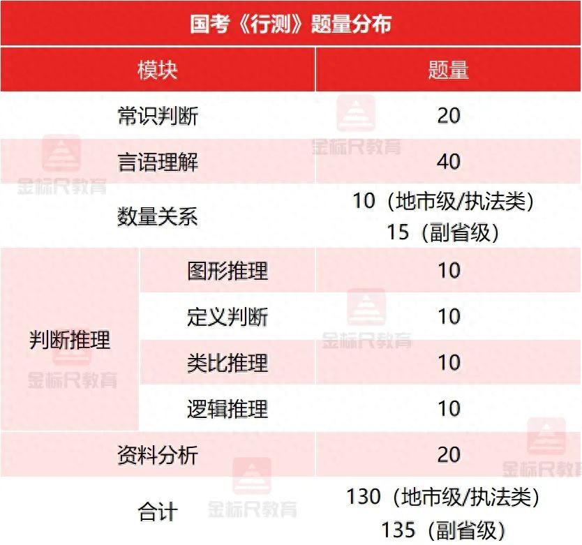 副省级为135道题,地市级和执法类分别是130道题,差距主要体现在数量关系上面。当然,除了题量以外,题目本身也有一些区别。总体来说题量比较多,时间非常紧凑,如何尽可能多拿分是关键。