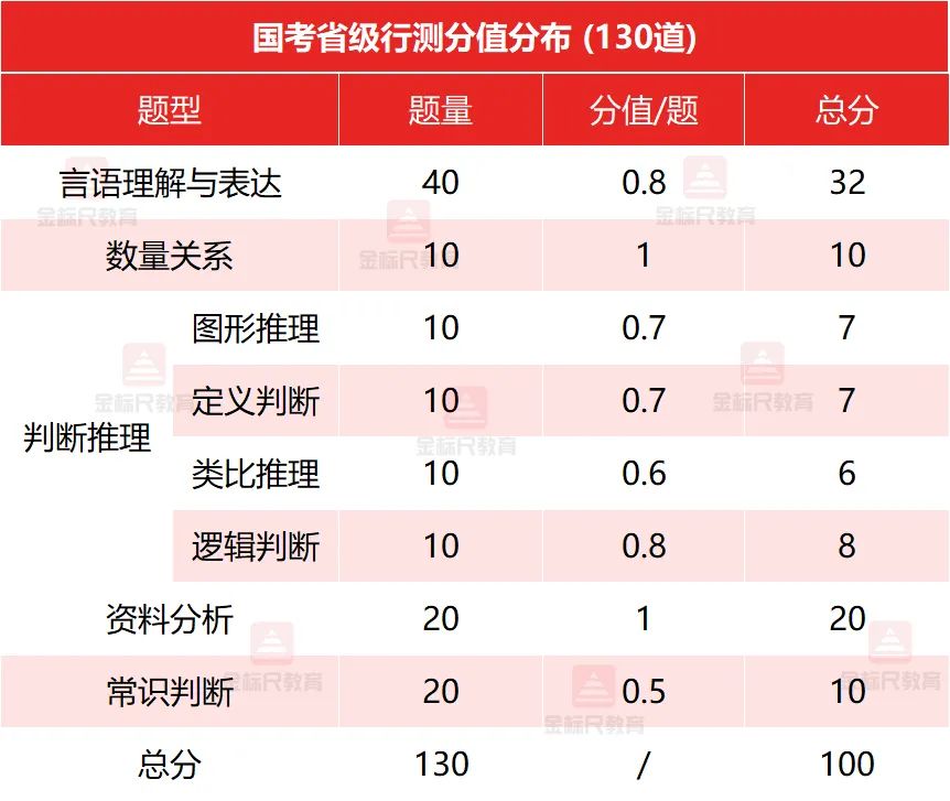 看到行测分值分布以后,各位同学应该就清楚哪些板块更重要了,像数量关系、资料分析、言语理解与表达、逻辑判断,都属于分值比较高的题目,这些板块正确率高,总分就容易更高。很多同学常说不知道复习重点在哪里,结合分值其实就知道了。
