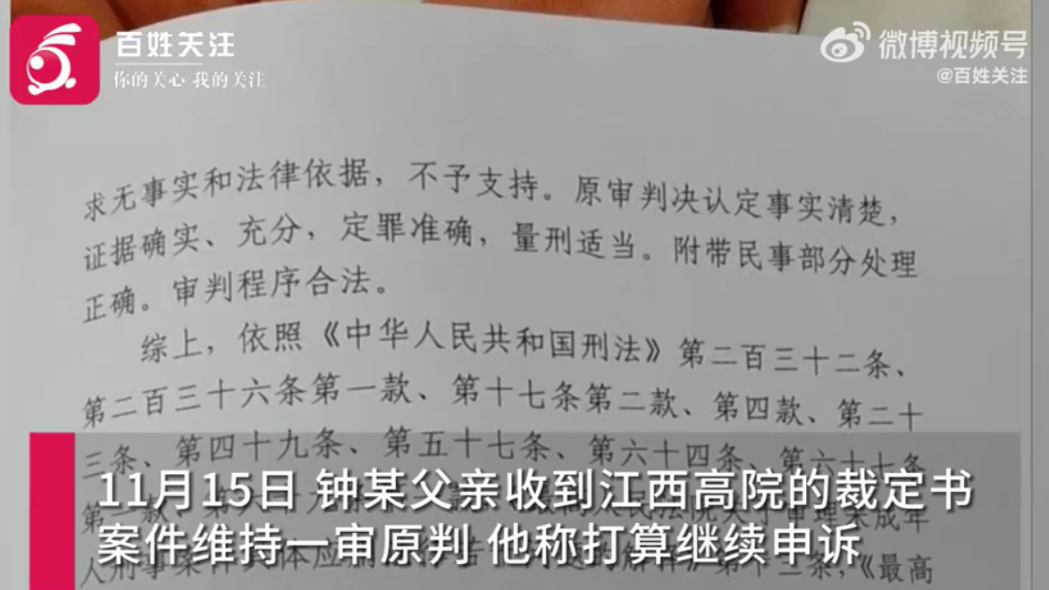 钟某家属提出抗诉和上诉,二审后江西高院做出维持原判的裁定。钟某父亲称打算继续申诉。