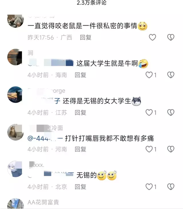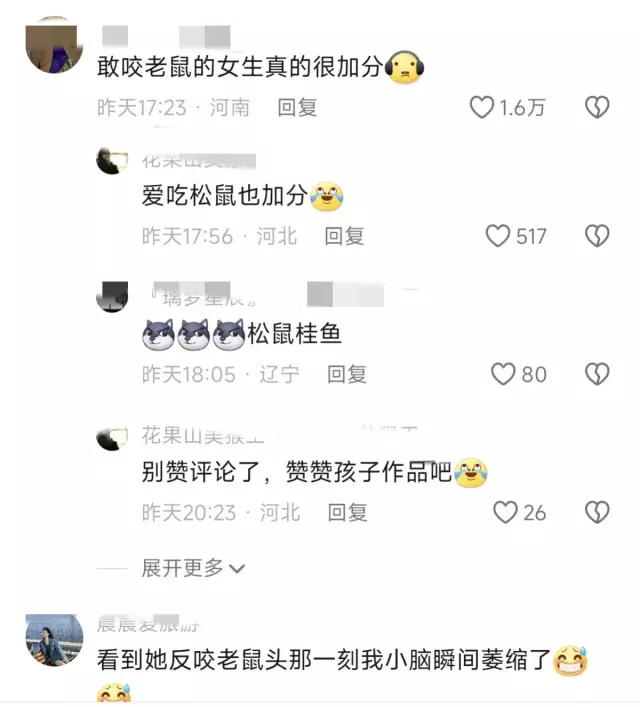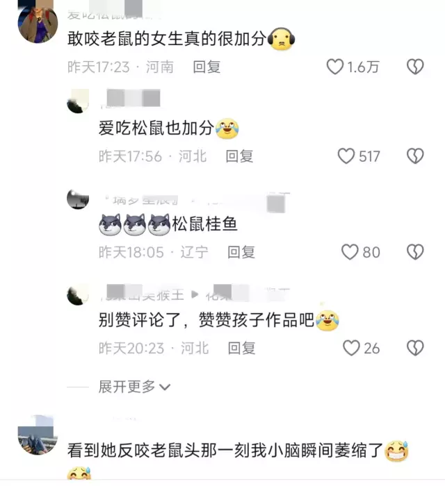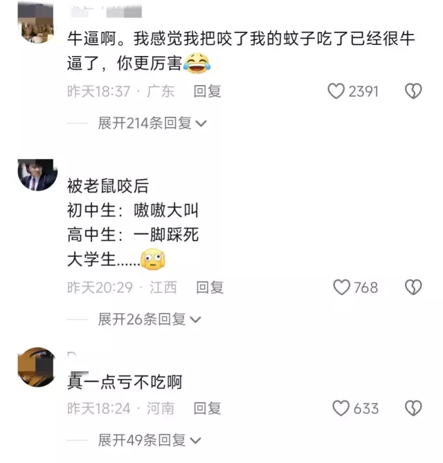 现在好了,告诉你一个不太好的消息,你咬老鼠的事,至少被几百万人看过了,你出息了孩子,现在才大学啊,你好勇敢啊。其实没佩服过谁,就服大学生,现在的大学生啊,就没有她不敢干的,而且还是个女生。