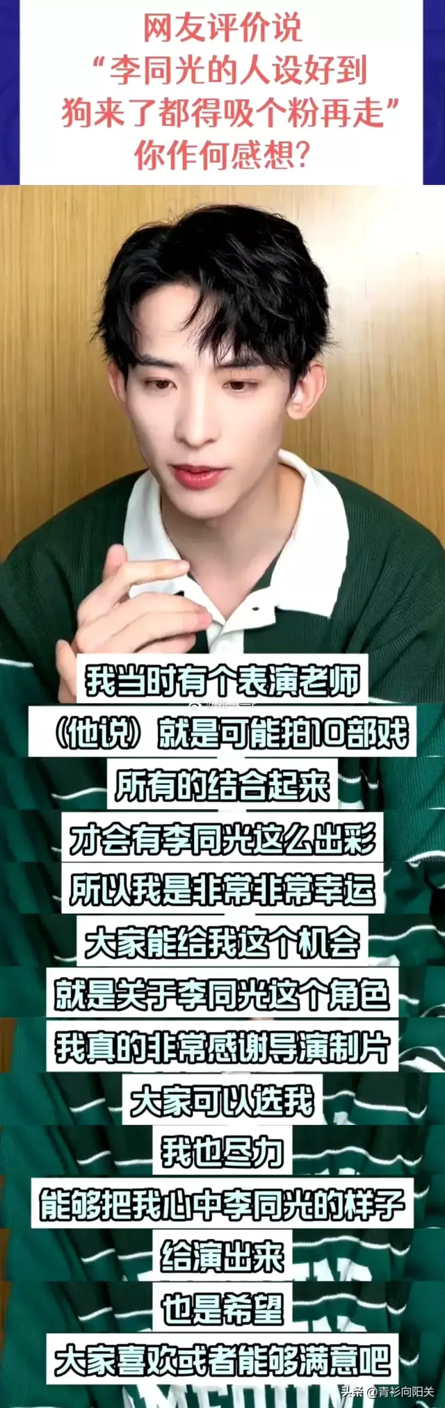 “我当时有个表演老师,就是说可能拍10部戏,所有的结合起来才会有李同光这么出彩跟疯批,所以我是非常非常幸运,大家能给我这个机会,就关于李同光这个角色我真的非常感谢导演制片大家可以选我,我也尽力能够把我心中李同光的样子给演出来,也是希望大家喜欢或者能够满意吧。”