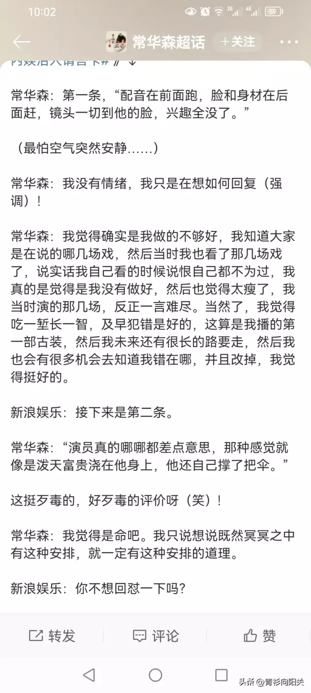 总之看完这段差评的采访直播,常华森是非常真诚的,换做其他演员可能黑脸或者顾左右而言他,常华森全程笑的很开心。