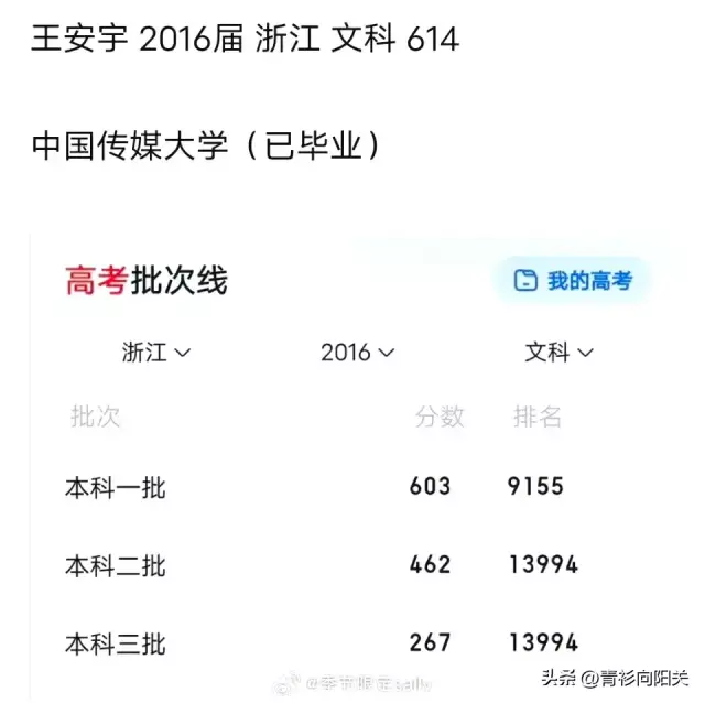 王安宇毕业于中国传媒大学播音主持专业,当年高考614分,高中就读于余姚中学,(能出省状元的一所重点高中)