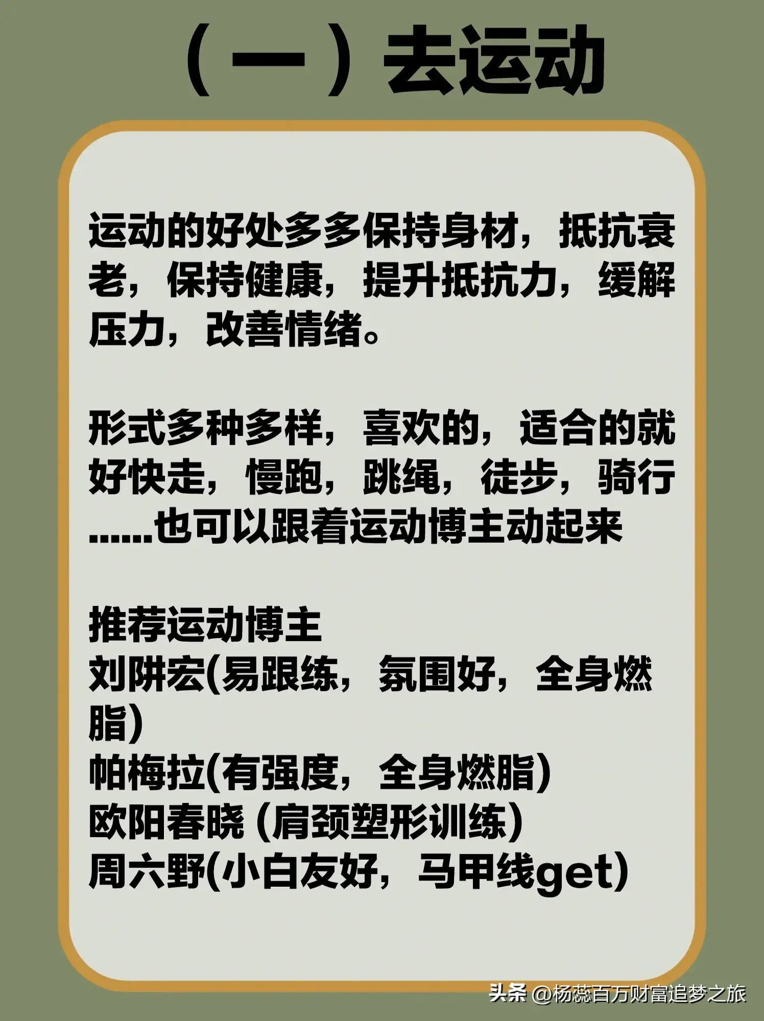 运动是最考验人耐心和毅力的一件事,能坚持下来,不仅可以让自己身体健康,还可以养成自律的好习惯,生活也会越来越有条不紊,心情也会越来越好。