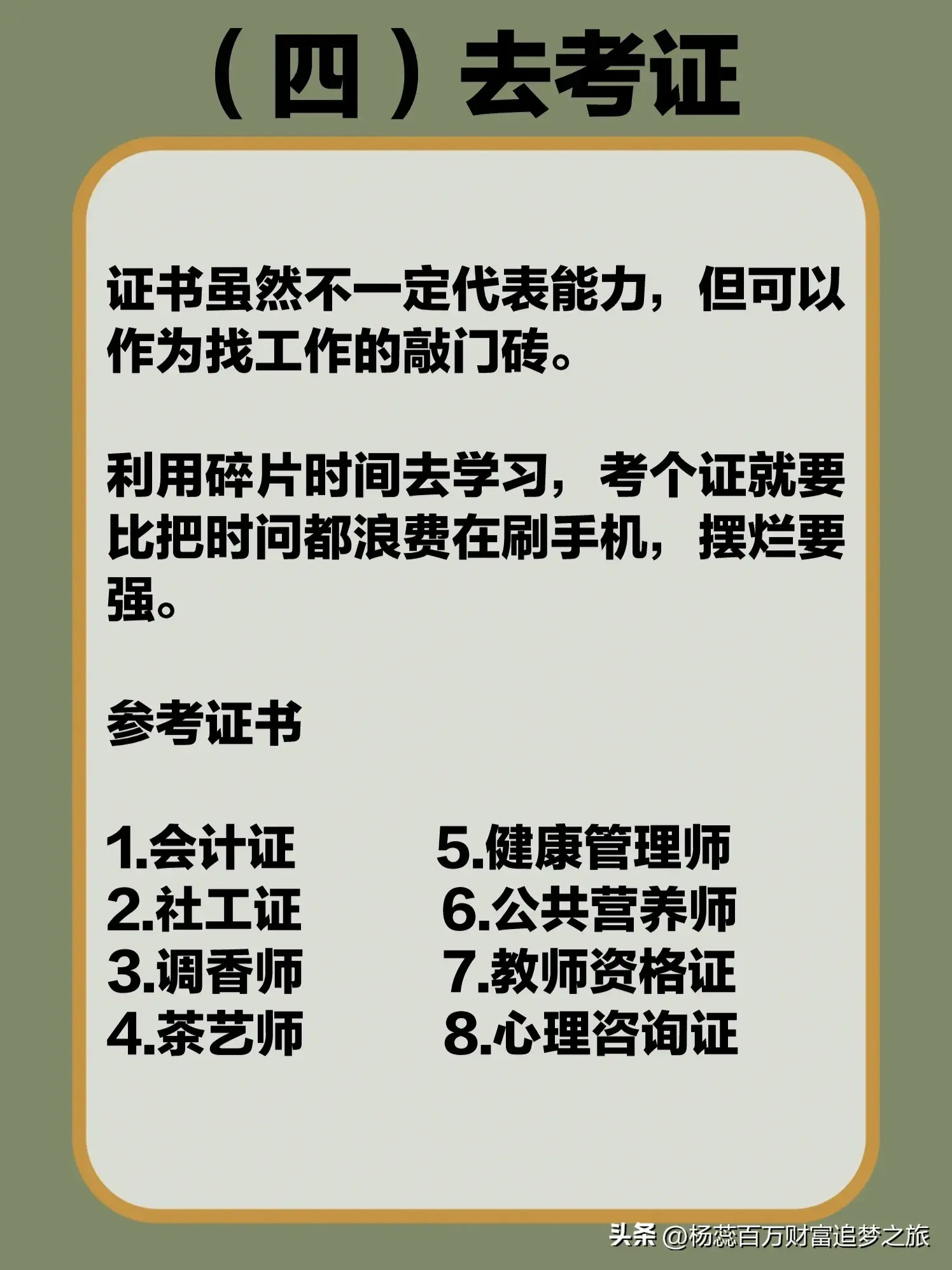 证书是找工作的敲门砖,如果错过了学历,就多去自学提升自己的技能,利用碎片化时间,去考个证书,图片给大家分享的有。