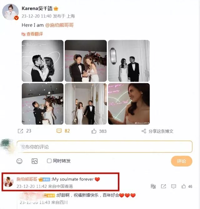 12月20日上午,演员吴千语在个人社交平台晒出多张婚纱照官宣与施伯雄结婚。紧接着,施伯雄现身评论区,并甜称新婚娇妻是“永远的灵魂伴侣”,甜齁了有木有。而施伯雄也在差不多的时间里,晒出了与吴千语的甜蜜合照撒狗粮,小两口发布情侣款文案示爱对方,高糖满满,确实是甜翻众人。而看到两人从相恋到结婚,真是打心底为他们感到开心。