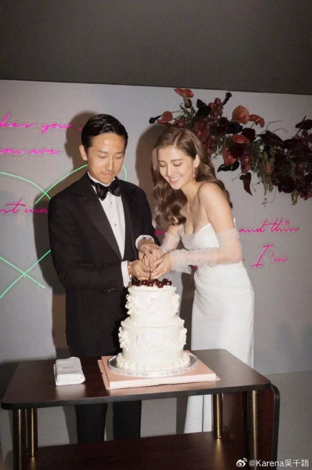 从晒出的婚纱照可以看到,吴千语当天的装扮真的好美、好仙。她披着波浪长卷发,化着精致美妆,身穿白色抹胸款式婚纱,一颦一笑都充满幸福甜蜜。施伯雄则是一身帅气西装,比起老婆的各种甜笑,他就显得有些害羞了,不过脸上的幸福喜悦还是一览无余。夫妻二人在众多亲友面前花式撒狗粮,估计在场的宾客已经被甜晕了吧,哈哈哈。